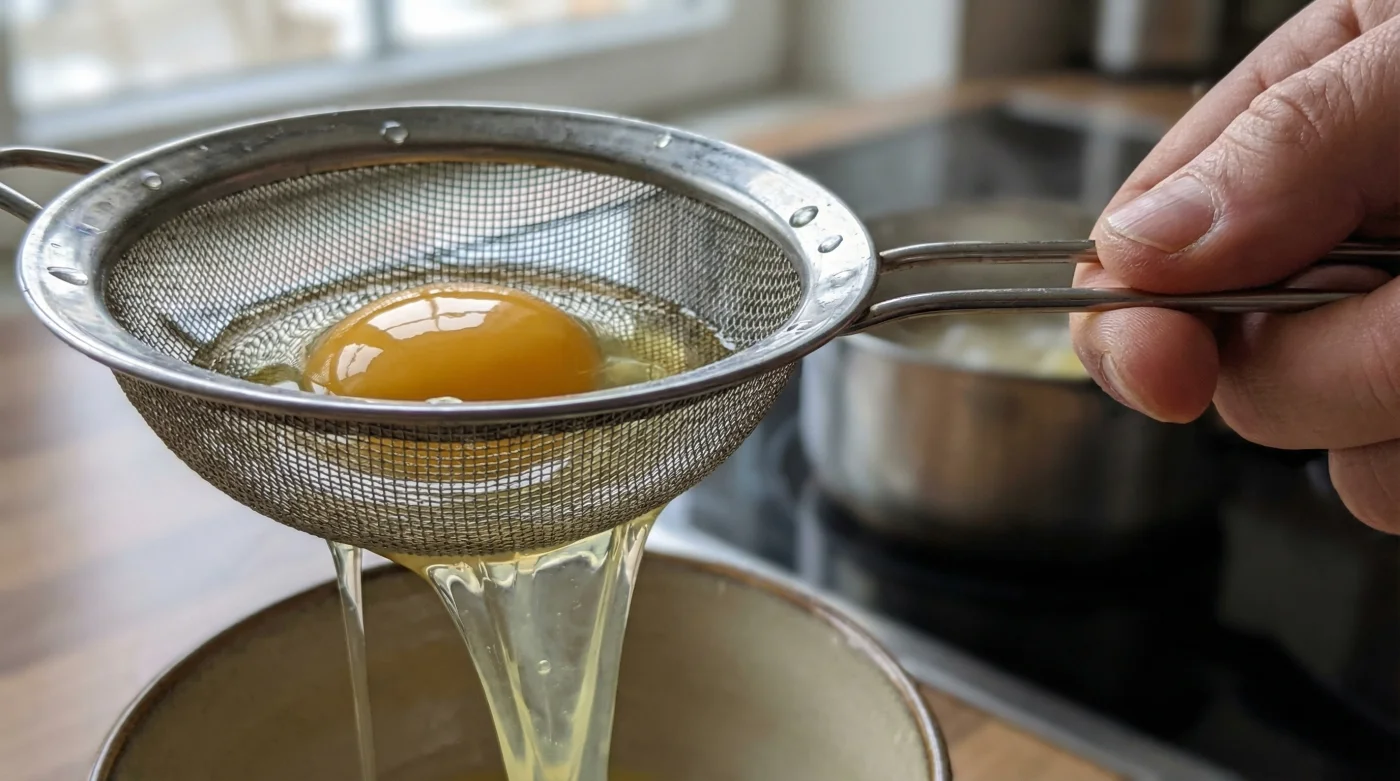 The physical application of this technique is wonderfully straightforward. Place your fine mesh sieve over a small bowl or the kitchen sink. Crack the egg directly into it. Take a moment to watch as the thin, clear liquid drips away through the wire. This takes merely ten to fifteen seconds.